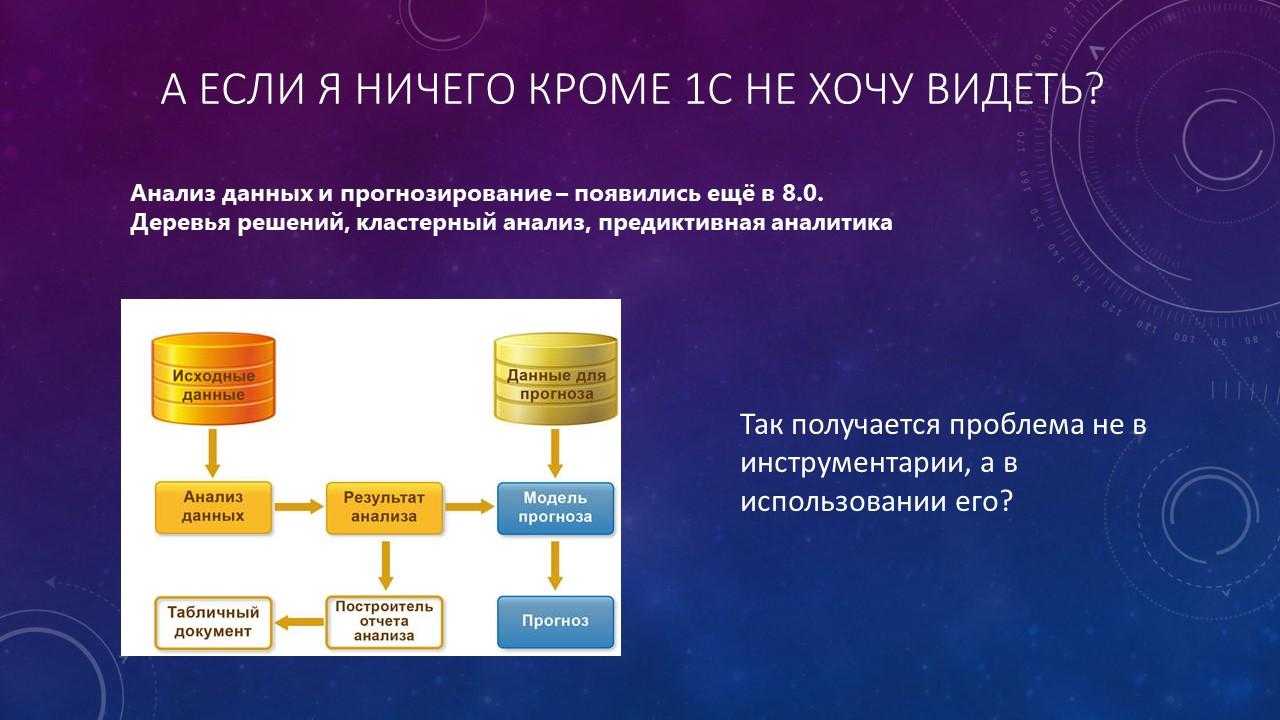 Для тех, кто совсем 1С-ник, а хочется сделать какую-то прогнозную модель, чтобы у вас 1С рекомендовала какие-то товары или какое-то обучение делала. Еще с 8.0 в 1С есть прекрасный механизм «Анализ данных и прогнозирование».