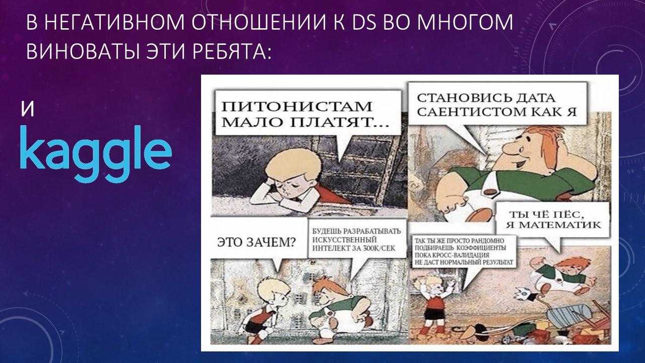 Во многом в появлении таких дата-саентистов виноват Kaggle – это платформа, где можно искать исполнителей, если вам нужно решить задачу, например, по построению модели для какой-нибудь статистики. Просто публикуете задачу на Kaggle, устанавливаете награду, например, 1000 рублей, и 200 школьников пытаются подобрать наиболее подходящую для вас архитектуру нейросети, наиболее подходящие параметры, проводят кросс-валидацию и т.д. и т.п. У кого лучше получилось, тот и получает деньги. Им интересно, а вам полезно, потому что вы за те же самые деньги получаете намного больше ресурсов.