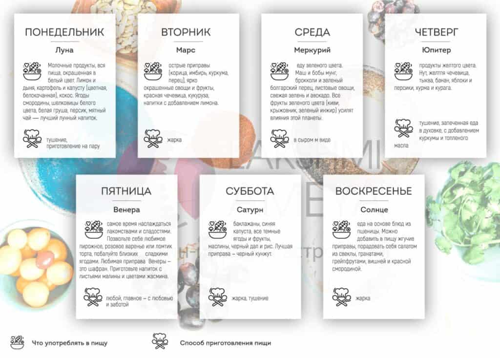 Также вы самостоятельно можете скорректировать режим питания, ориентируясь на планеты, которые управляют каждым днем недели. Такой подход к составлению меню для вас и членов семьи позволит укрепить иммунитет, улучшит состояние здоровья.