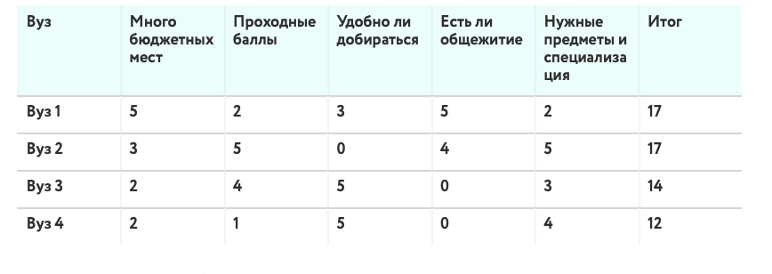 Занесите в строки таблицы варианты, из которых надо сделать выбор, а в столбцы — факторы для оценки. Затем оцените их по шкале от 0 (плохо) до 5 (очень хорошо). Суммируйте баллы, и вы увидите, какие варианты выгоднее по объективным параметрам. Чтобы выбрать из них, подключите ценности. Например, в таблице два первых вуза явно лидируют по очкам, осталось решить, что для вас важнее — удобное расположение или низкие проходные баллы.