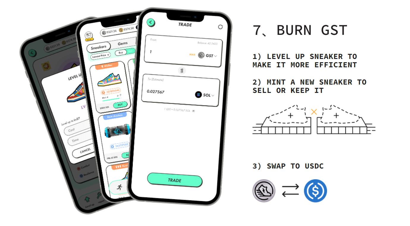 Два кроссовка можно скрестить между собой, заплатив за это комиссию в GST, и получить третий кроссовок. Полученный кроссовок можно также скрестить с одним из первых и получить четвертый кроссовок. Этот процесс можно совершать бесконечно, каждый раз платя комиссию в GST. Для того, чтобы окупить эту комиссию, полученные кроссовки можно продавать и таким образом зарабатывать на «производстве» кроссовок.