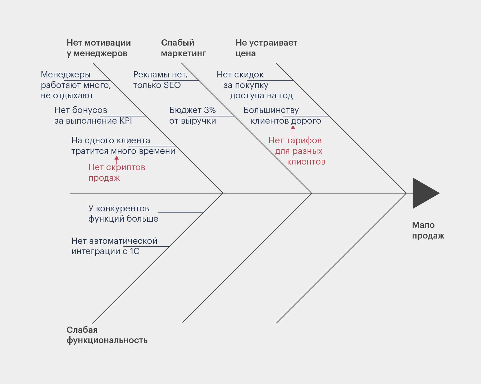 Вот диаграмма Исикавы, составленная для анализа проблемы — у компании низкие продажи.