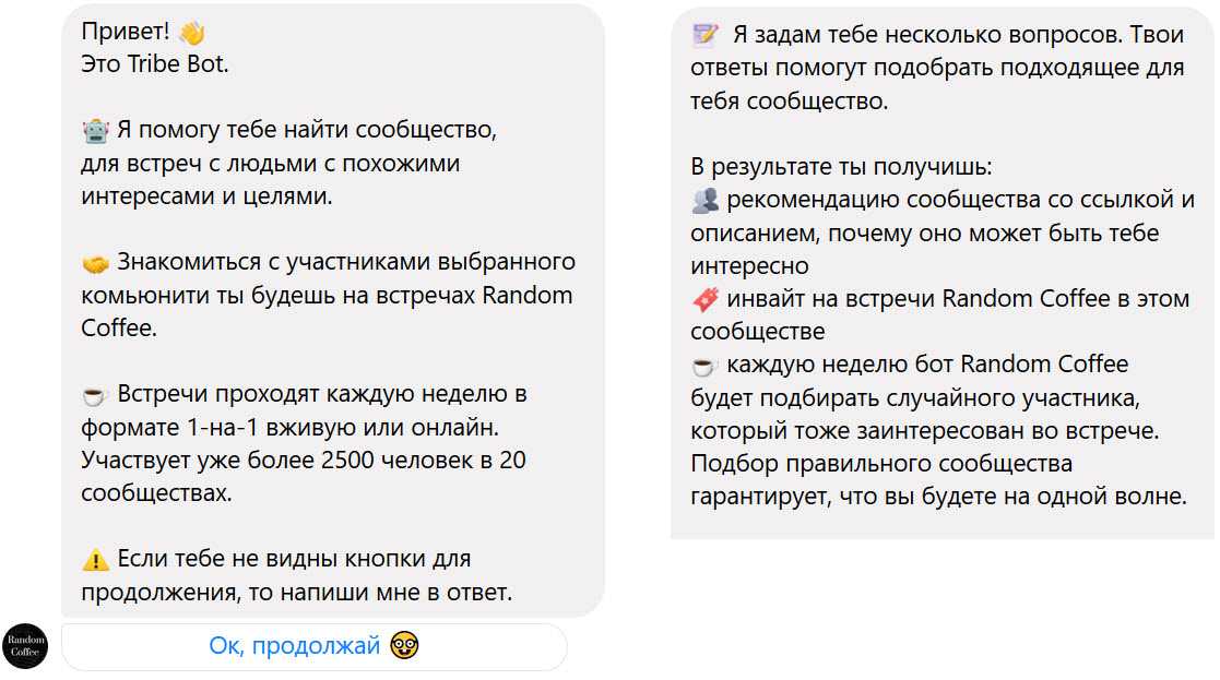 Если ты кому-то написал и позвал на кофе, от тебя ждут, что ты что-то хочешь получить от встречи. «У нас у всех есть барьер, который не позволяет написать незнакомому человеку», — говорит Константин, — «Мы все думаем, что нам скорее всего откажут — это неприятное ощущение. На встрече формата Random Coffee вы полностью равны. Вы находитесь не в равной ситуации — ты как будто просящий. Все неловкости снимает бот».