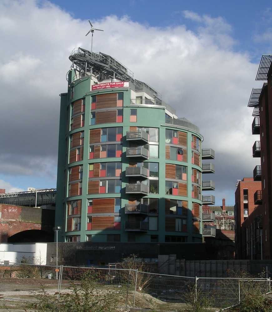 Зелёное здание – многофункциональный комплекс с ветряной турбиной, солнечными панелями и общими газовыми котлами недалеко от центра Манчестера, Англия
