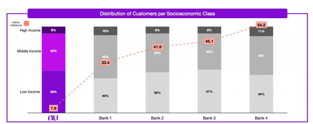 Incumbent banks have monthly APRACs of $38, which is roughly ~8X that of Nubank’s. Given Nubank’s lower fees, while they might not reach that level, there is significant room to grow ARPACs by focusing on:
