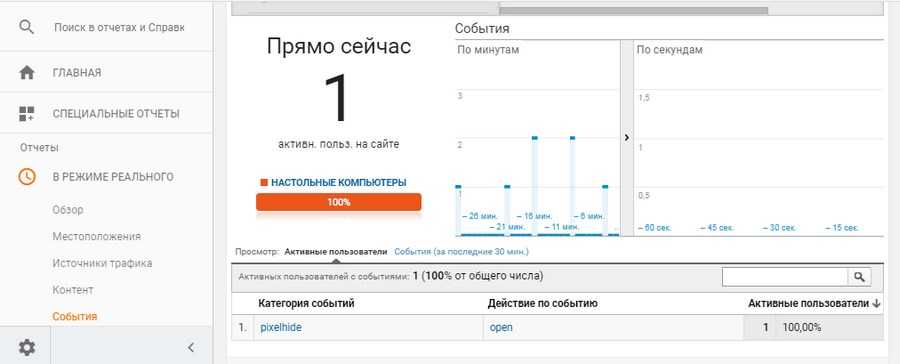 - Прежде чем отправлять важные письма со скрытым пикселем, нужно понять, что выбранный способ работает. То есть, сначала пробуйте на своих имейлах. В Google Analytics результат виден сразу, если открыть отчет по событиям в реальном времени (как на скриншоте в начале второго раздела).