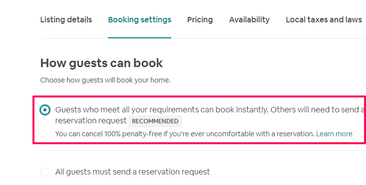 Теперь нажмите Запросы на бронирование и выберите либо Нет or Да для включения и выключения мгновенного бронирования соответственно.