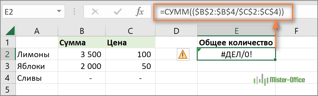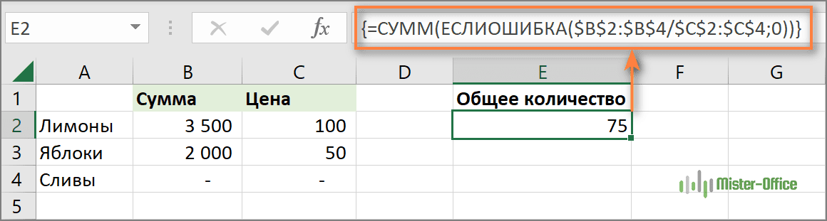 Что делает эта формула? Делит значение в столбце B на значение в столбце C в каждой строке (3500/100, 2000/50 и 0/0) и возвращает массив результатов {35; 40; #ДЕЛ/0!}. Функция ЕСЛИОШИБКА перехватывает все ошибки #ДЕЛ/0! и заменяет их нулями. Затем функция СУММ суммирует значения в итоговом массиве {35; 40; 0} и выводит окончательный результат (35+40=75).