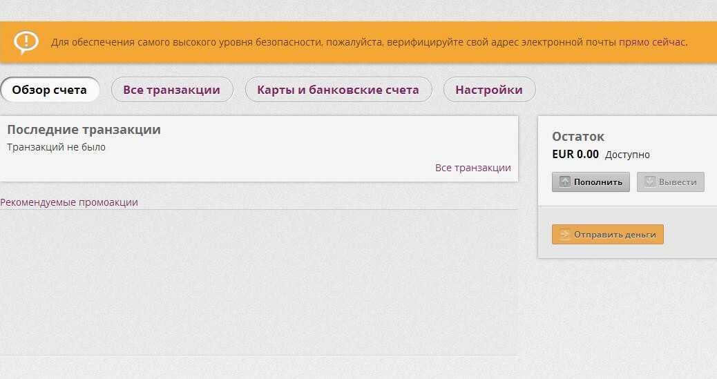 Как видим, в личном кабинете Skrill нет ни слова о верификации личности. Но это лишь до появления средств на счете.
