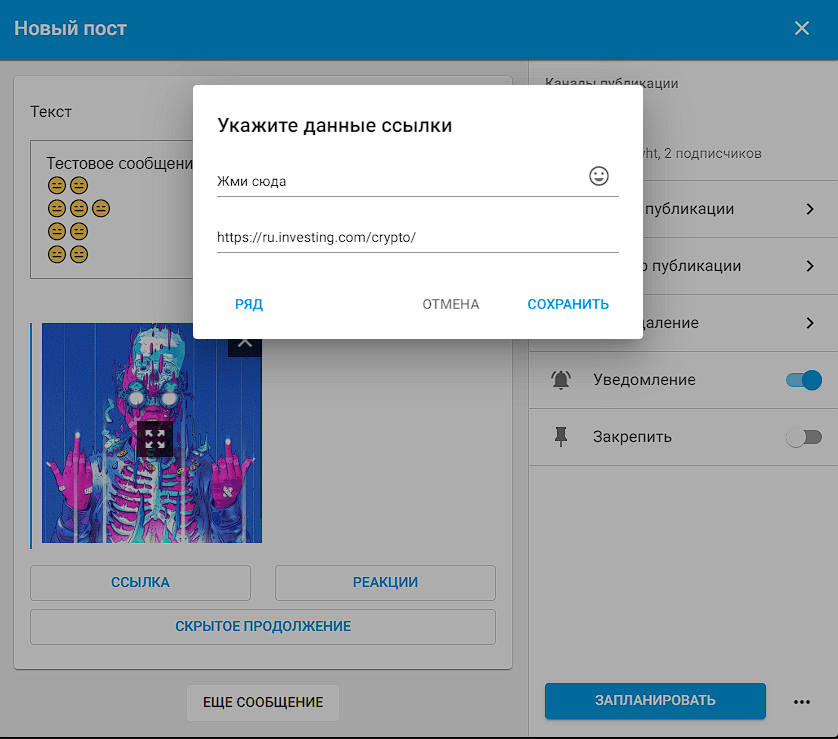В поле Текст, вводим текст для поста. Теперь нажимаем “Ссылка”, пишем название, и вставляем саму ссылку. Всё, ваша кнопка для канала готова!