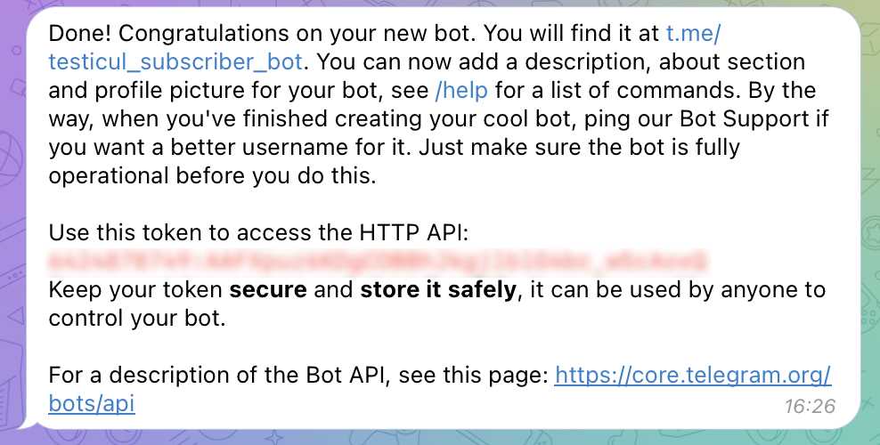 Далее вводим название вашего бота на русском. Я назвал бота “Бот канала Дмитрия Языкова”. На втором шаге надо ввести логин бота на латинице без пробелов, заканчиваться имя должно на _bot. У меня это yazykov_subscribe_bot. Логин бота должен быть уникальным. Как только вы все сделаете правильно, BotFather пришлет вам сообщение с уникальным токеном вашего нового бота. Он нам понадобится позже.