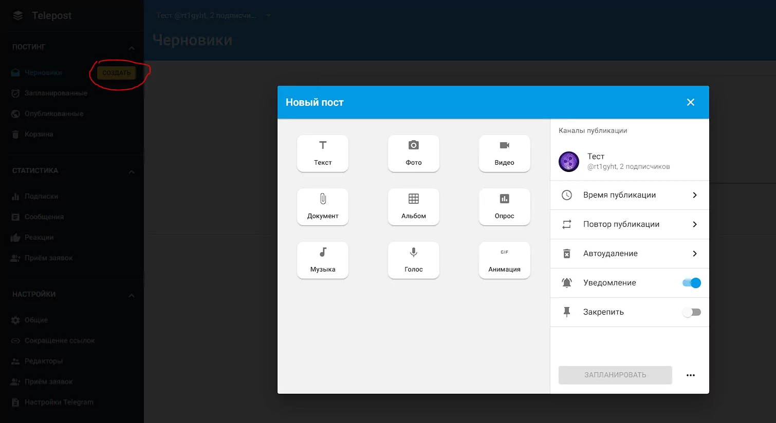 После добавления бота, нажимаем “Сохранить”. После выполнения этих операций, подключаем свой канала к сервису Telepost и радуемся.