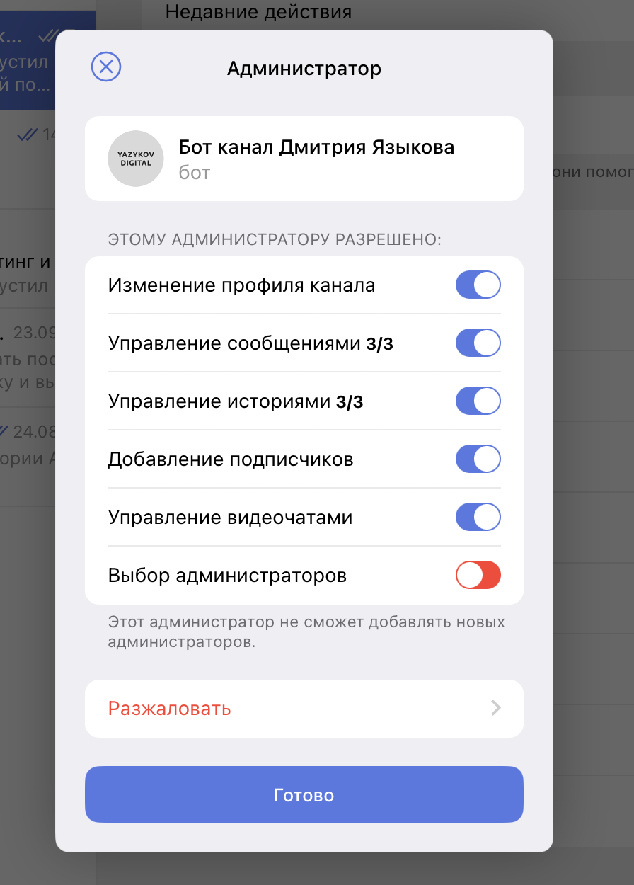 Нажимаем добавить администратора и находим бота по его логину, а затем даем права на все, кроме выбора администраторов.