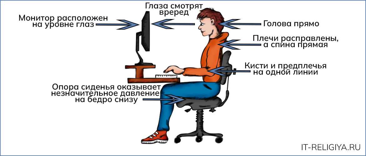 - Сидите прямо, не забывайте следить за осанкой. После длительных часов работы за ПК организму нужно немного расслабиться, так и хочется «развалиться» в кресле. Но так вы не отдохнете — спина и позвоночник только сильнее напрягаются. Лучше просто пройтись или сделать простые физические упражнения.
