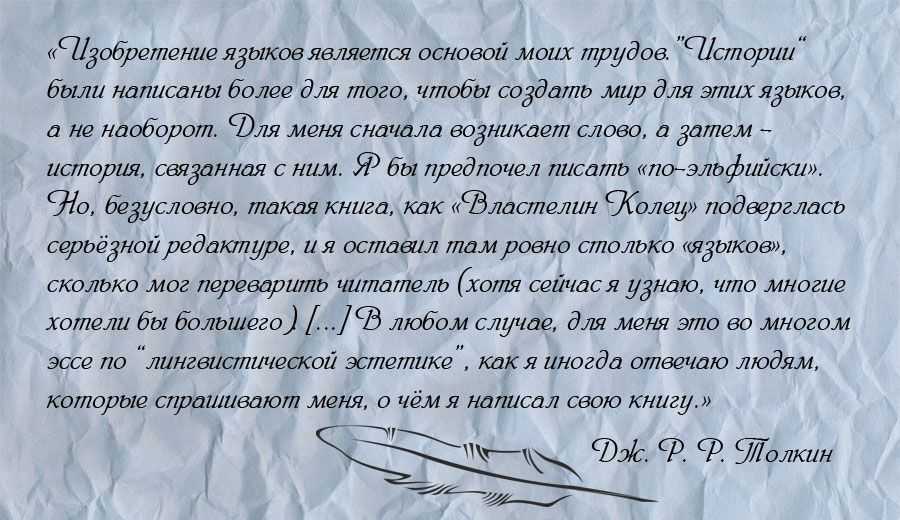 Так что весь многогранный мир фэнтези, построенный на творениях Толкина, появился благодаря желанию одного парня как-то использовать тысячи несуществующих слов, которые он зачем-то придумал и запомнил.